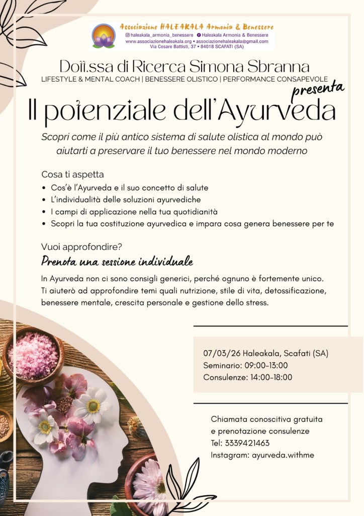 Cosa ti aspetta: Cos’è l’Ayurveda e il suo concetto di salute L’individualità delle soluzioni ayurvediche I campi di applicazione nella tua quotidianità Scopri la tua costituzione ayurvedica e impara cosa genera benessere per te