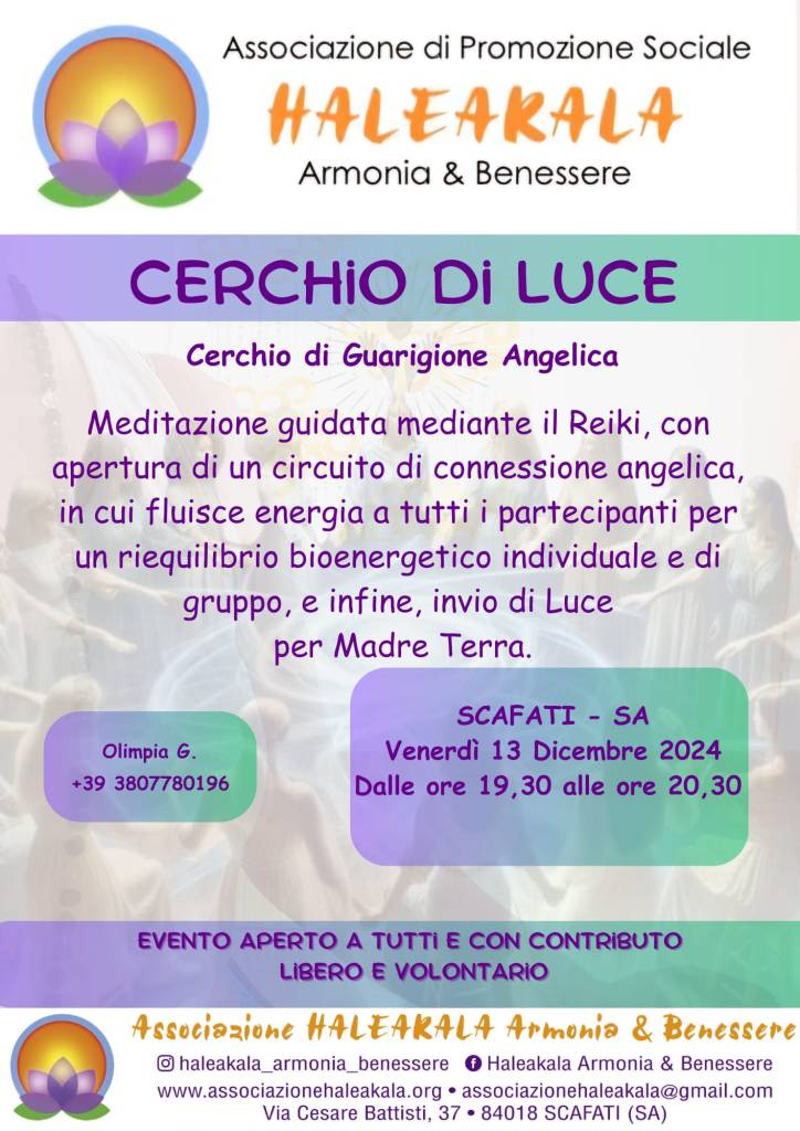 Il Cerchio di Luce o Cerchio Reiki, è una tecnica di meditazione guidata di gruppo per la guarigione e invio di Luce alla Madre Terra. Ho sviluppato una tecnica di alchimia trasformativa, frutto di intuizioni e vari studi (tra cui Reiki Usui e Karuna, Formazione Spirituale sui 7 Raggi e Raggi Occulti, Connessione Angelica) che utilizzo all’interno del Cerchio. È un momentum di Luce, fatto di condivisione di intento ed energie, un contatto animico di autoguarigione, una forma di riequilibrio energetico per sé stessi e per gli altri. Attraverso la partecipazione solidale, si fa esperienza dell’energia potenziata, apprezzando la condivisione e la coesione, nonché la potenza geometrica del cerchio stesso, che va a creare continuità nel flusso energetico sostenuto attivamente dal gruppo e dalla Purezza dell’ intento: completa armonia. Attraverso tecniche di respiro, di centratura al cuore, armonizzazione dei corpi sottili, si va a sostenere la sacralità del cerchio permettendo l’apertura di un campo quantico armonioso e protetto di guarigione energetica.