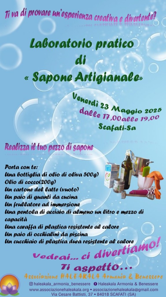 laboratorio di Autoproduzione di sapone artigianale 2 Maggio 2025 | Haleakala Armonia & Benessere venerdì 23 maggio 2025 dalle 17,00 alle 19,00 porta con te gli ingredienti indicati e partecipa all’incontro teorico pratico tenuto da Maria Giovanna Vitiello insegnante di Yoga e appassionata amante del pianeta Terra Condividi: Fai clic per condividere su X (Si apre in una nuova finestra) X Fai clic per condividere su Facebook (Si apre in una nuova finestra) Facebook Mi piace Caricamento... Correlati