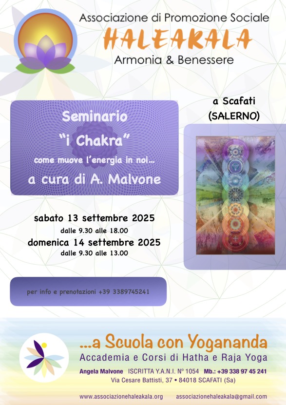 Il seminario teorico e pratico ci farà sperimentare tecniche di respiro, esercizi e pratiche yoga per ciascun chakra, atti a migliorare la nostra condizione psico-fisica ed energetica.